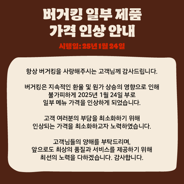 2025년 1월 24일부터 적용되는 버거킹의 새로운 가격은 다음과 같습니다:
