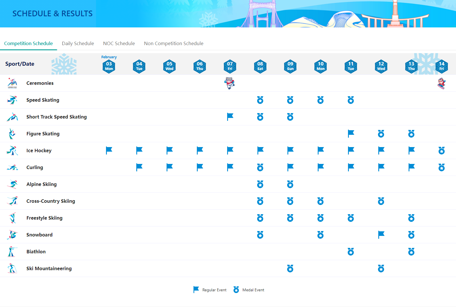 - 개막식: 2월 7일 19:30 (하얼빈 올림픽 스타디움)