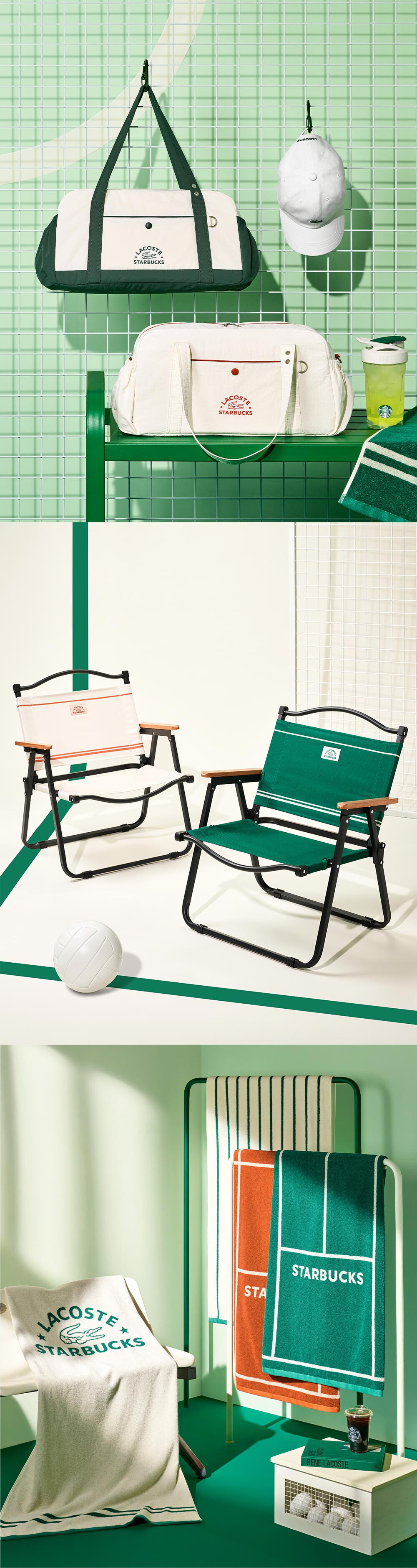 스타벅스 굿즈는 실용성과 스타일을 모두 갖춘 10종으로 구성되었습니다. 각 굿즈는 스타벅스의 그린과 라코스테의 테라코타 컬러로 디자인되어 여름 야외 활동에 최적화되었습니다.