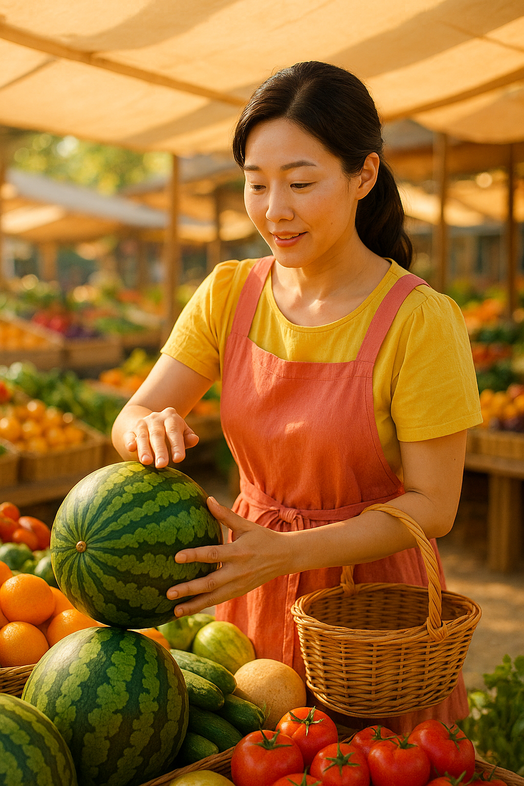 - 무게감: 같은 크기의 수박 중 무거운 쪽이 수분과 당도가 풍부해요. 손으로 들어보며 비교해보세요.